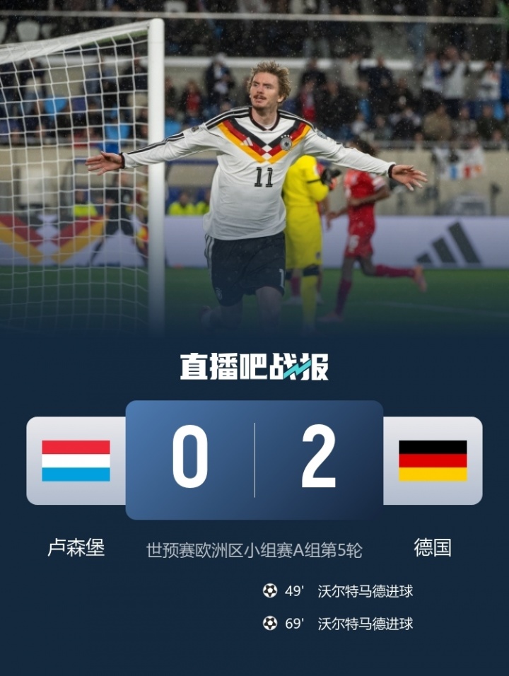 11月15日讯 世预赛欧洲区小组赛第5轮,德国客场2-0击败卢森堡,沃尔特马德包抄梅开二度。德国末轮打平斯洛伐克就能以头名出线。