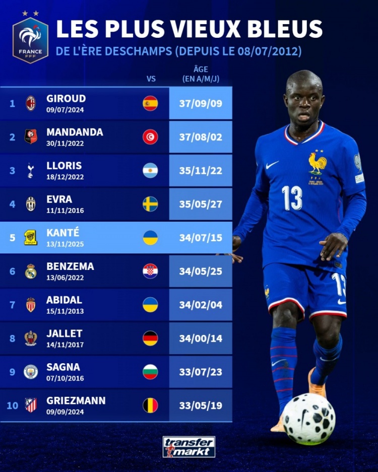 11月15日讯 世预赛欧洲区比赛,坎特踢满全场,帮助法国主场4-0击败乌克兰,德转列出了德尚执教法国队以来年龄最大出场球员排名,吉鲁居首,坎特排在第5位。