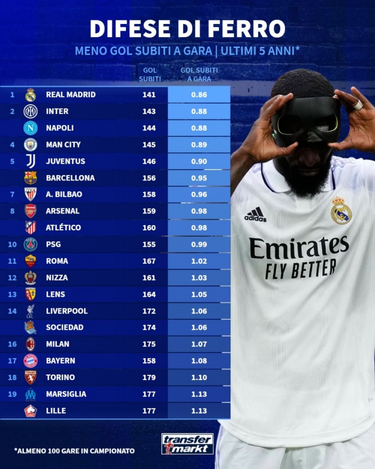 11月15日讯 德国转会市场统计了2020-2021赛季以来球队在五大联赛中的场均失球,并列出场均失球最少榜单,皇马0.86球居首,国米、那不勒斯前三。