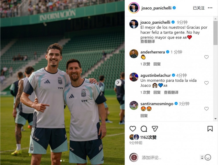 11月15日讯 阿根廷新晋国脚帕尼切利更新社媒动态,晒出与梅西的合照。