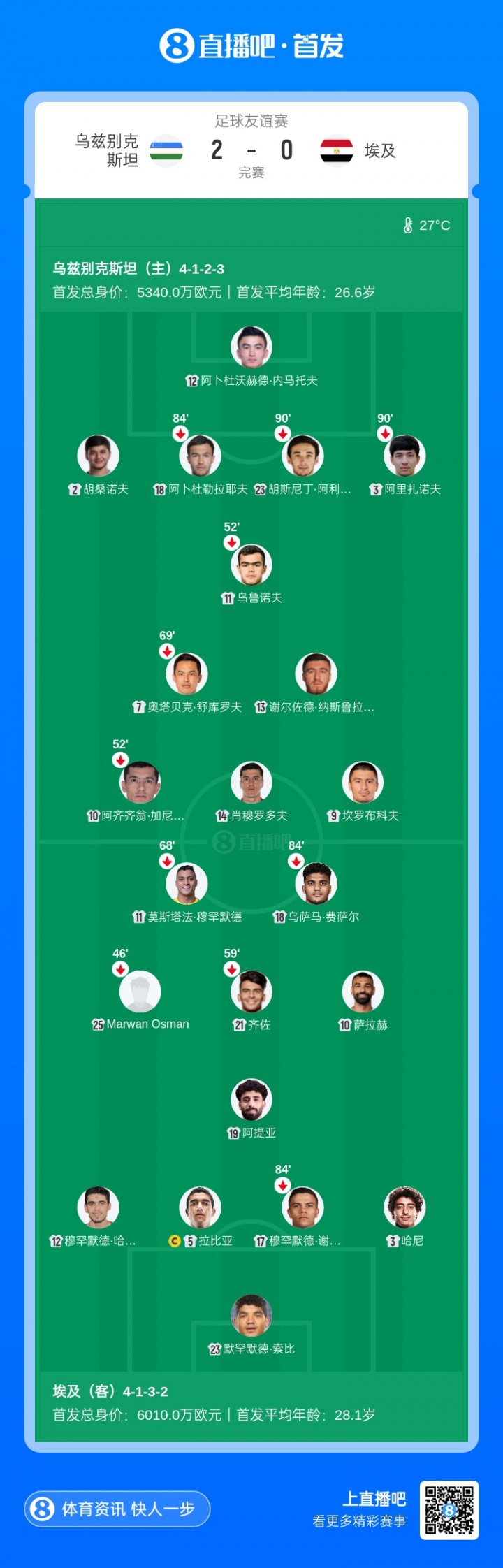 比赛第43分钟,乌兹别克斯坦中场直塞打穿埃及防线,乌鲁诺夫过掉门将再下一城↓