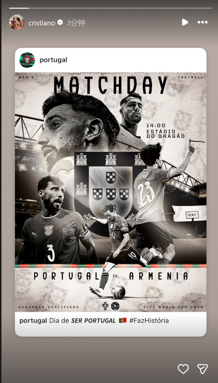 染红停赛⚽C罗社媒转发世预赛海报,为葡萄牙国家队加油