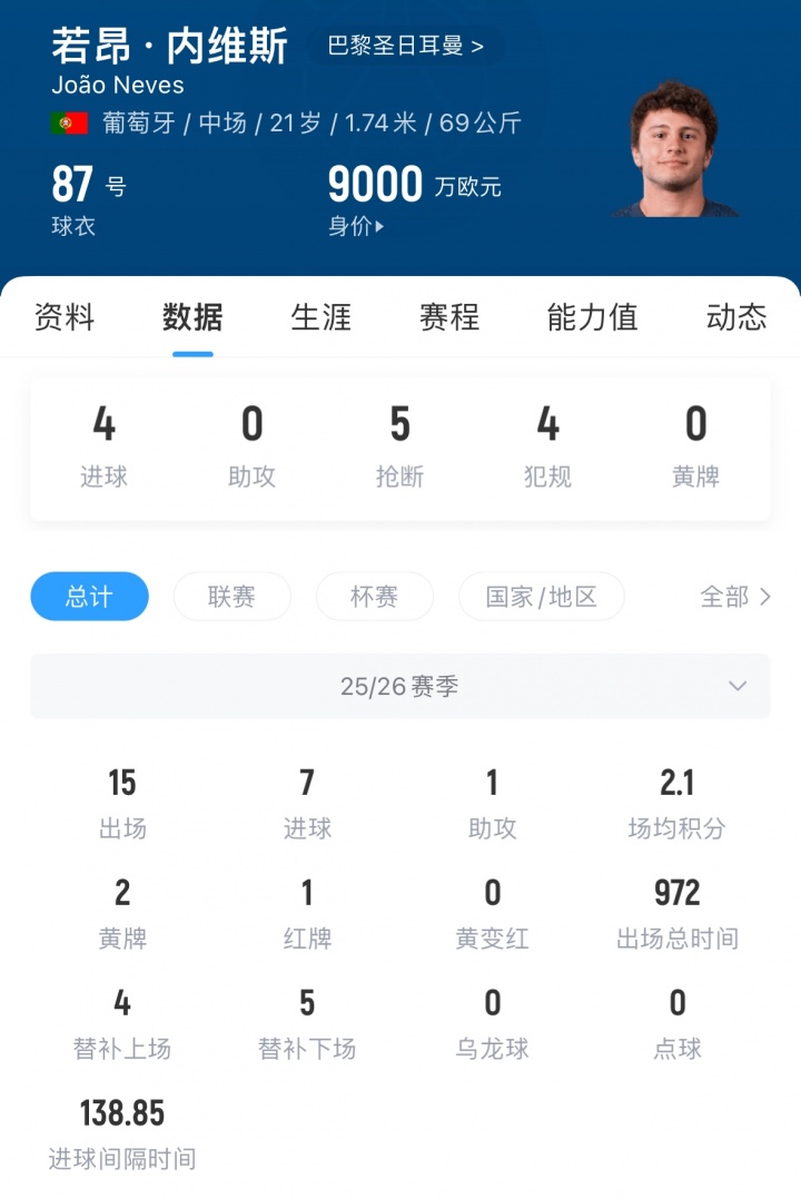 凭借自己稳定且亮眼的表现,内维斯的身价如今已经涨至9000万欧,他与巴黎的合同在2029年到期,现年薪仅582万欧。