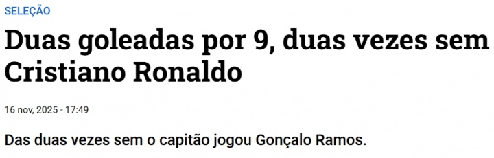 而在这两场比赛中,C罗均因停赛缺席,贡萨洛·拉莫斯则两次代替C罗首发。在对阵卢森堡的比赛中,拉莫斯梅开二度,而本轮对阵亚美尼亚,他贡献了一球一助。