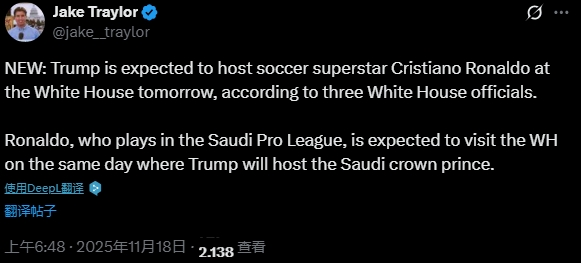 白宫记者:根据官员消息,美国总统特朗普明日将在白宫接待C罗