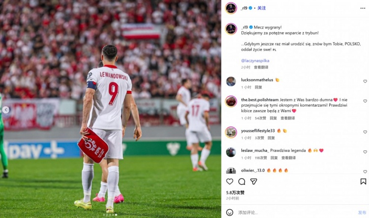 他也在赛后通过社媒晒出自己的比赛照,并深情告白:“拿下这场胜利!感谢看台上球迷们的热情支持!……如果能够重生,我仍然愿为你付出生命,波兰!”