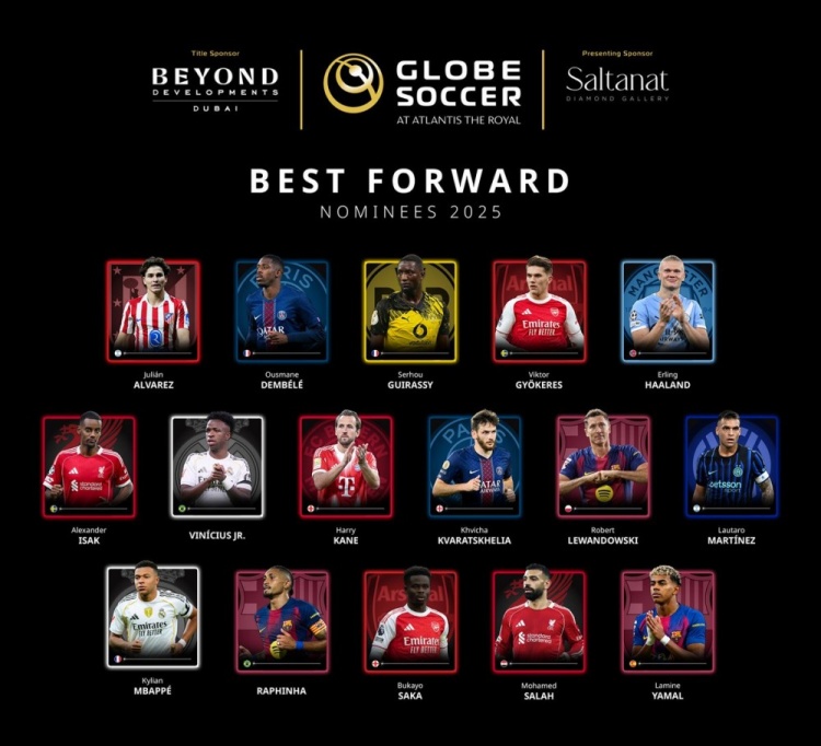 11月19日讯 环球足球奖公布了2025年最佳前锋候选,姆巴佩、哈兰德、登贝莱、亚马尔在列。