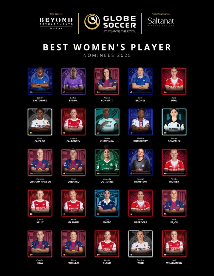 11月19日讯 环球足球奖公布了2025年最佳女足球员候选名单,邦马蒂、汉森、汉普顿、普特拉斯、凯莉、鲁索在列。