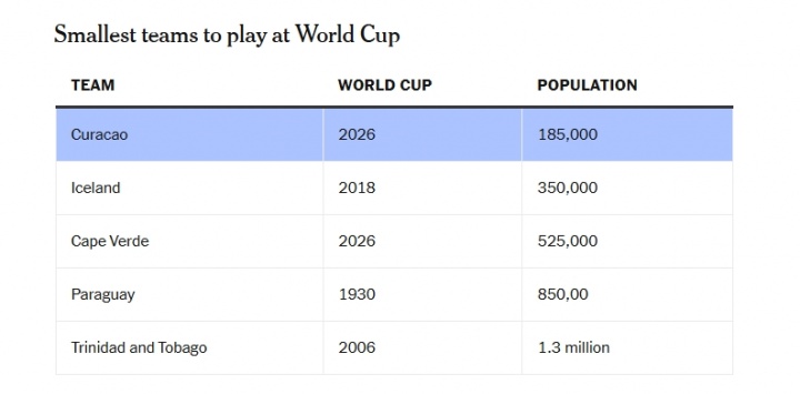 11月19日讯 2026年世界杯,佛得角和库拉索首次进入世界杯,他们的人口数量也相当少,据TA统计,库拉索及佛得角进入参加世界杯最少人口排名前5,库拉索最少。
