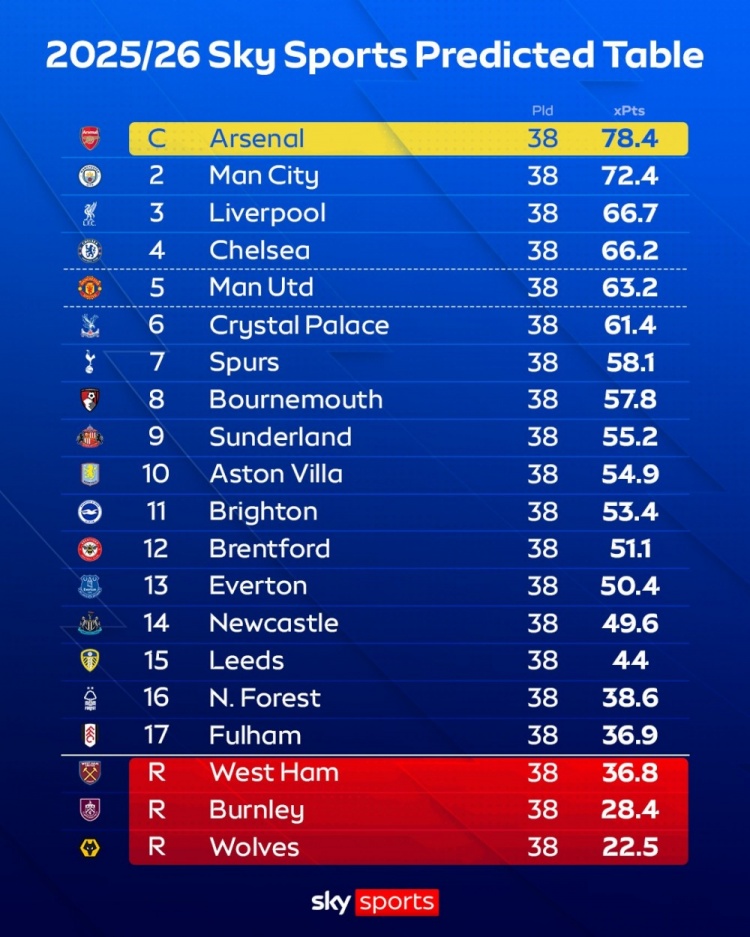 天空体育预测英超结局:枪手夺冠,曼城、红军、蓝军、曼联前五
