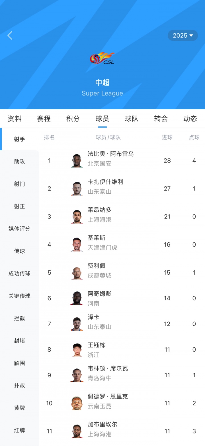 11月22日讯 2025赛季中超结束,末轮比赛法比奥大四喜,瓦科梅开二度,最终法比奥反超瓦科夺得本赛季中超金靴。