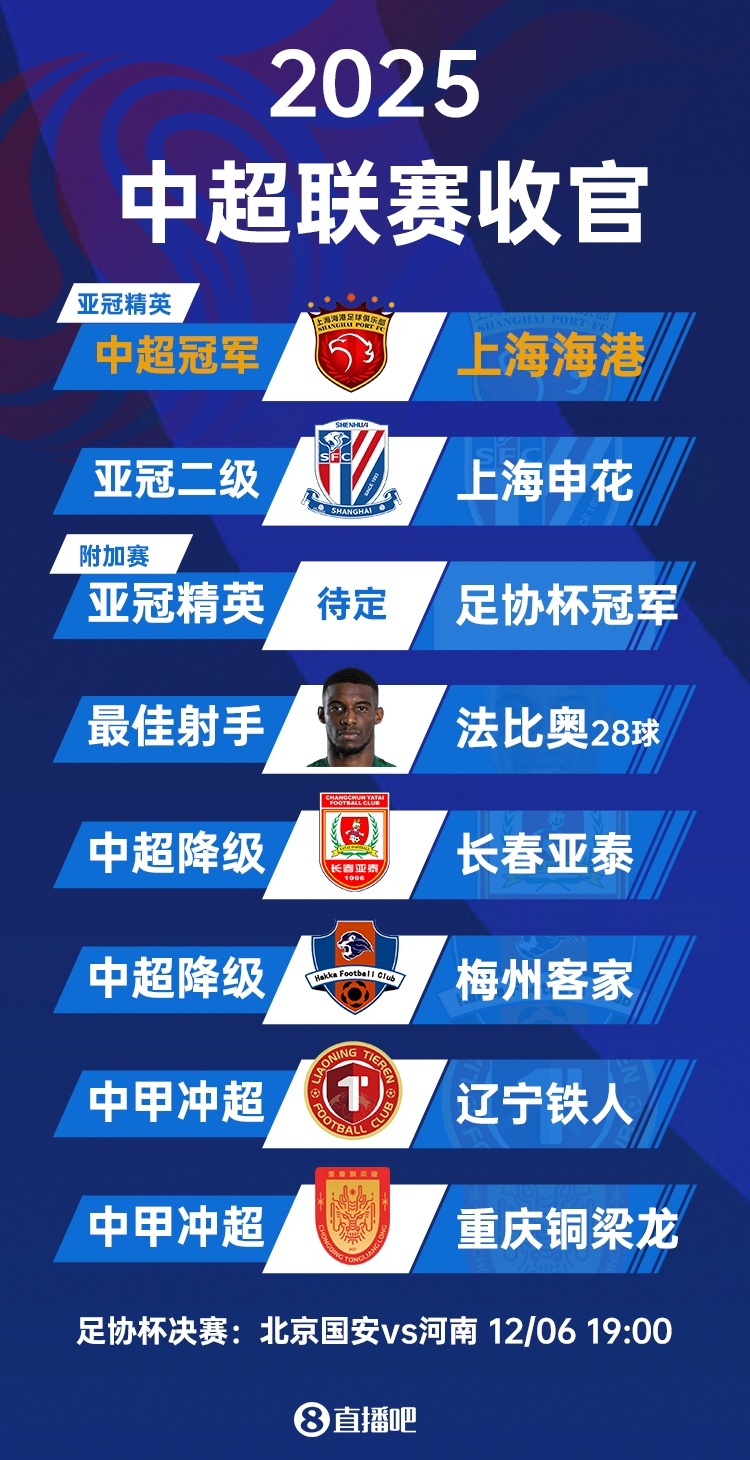 11月22日讯 2025赛季中超落下帷幕,上海海港连续三个赛季夺得中超冠军,上海申花获得亚军,蓉城获季军。长春亚泰和梅州客家降入中甲。法比奥28球夺得本赛季中超金靴奖。