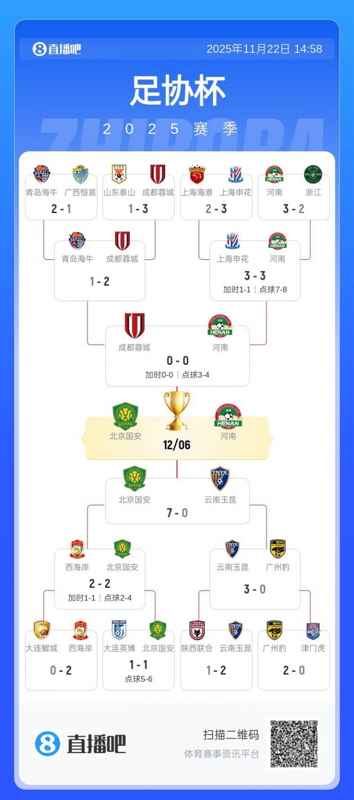 足协杯闯入决赛,将在12月6日对阵河南队