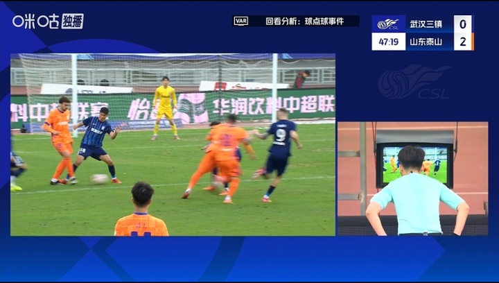 11月22日讯 泰山vs三镇第49分钟,泽卡禁区内倒地,裁判亲自回看VAR,泰山获得点球!