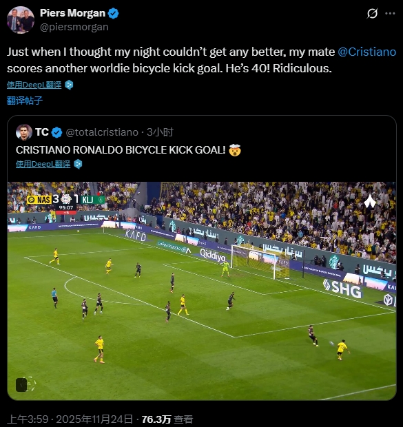 英国著名主持人、阿森纳球迷摩根更新社媒动态:正当我以为今晚已经再无惊喜时,我的兄弟@C罗又踢进一记世界级的倒钩球。他都40岁了!简直不可思议。