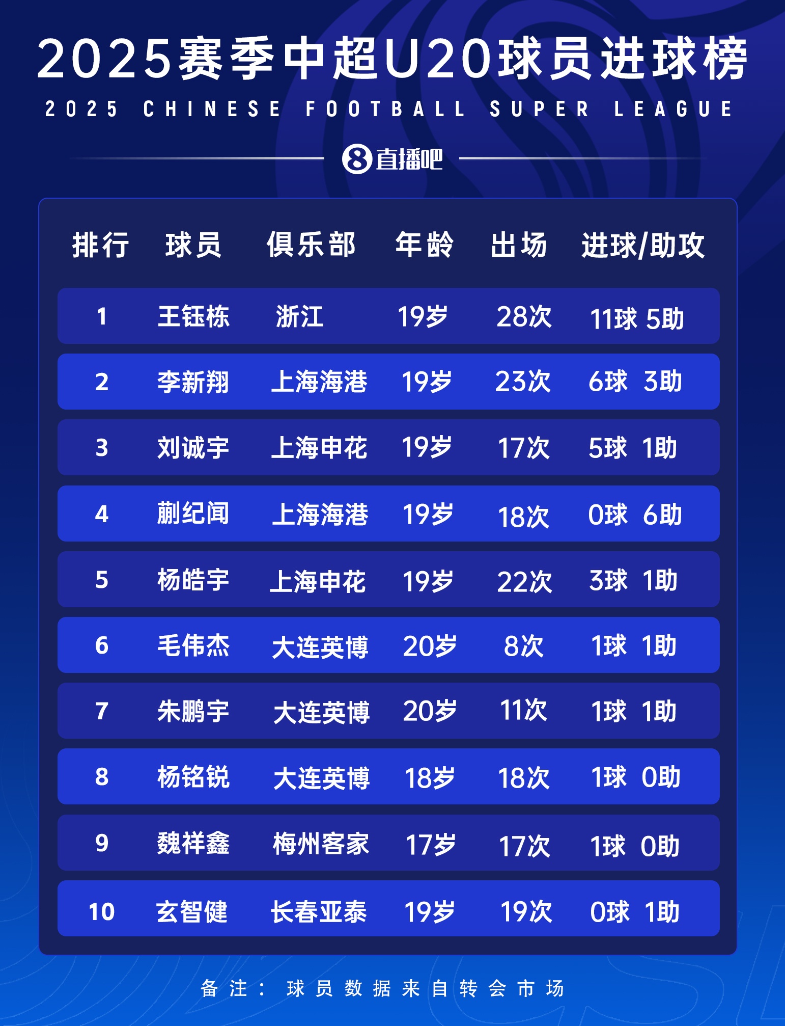 2025赛季中超联赛大幕落下,上海海港成功卫冕,梅州客家和长春亚泰降入中甲。在漫长的9个月征程中,外援撑起了各队的战术框架,本土中生代球员和老将发挥着关键作用,在这两股力量的夹缝中,U20球员艰难地寻找着上升路径。在王钰栋、朱鹏宇、李新翔、徐彬和魏祥鑫等人的惊艳表现背后,更多初涉中超的小将还在为跻身轮换阵容而拼搏。