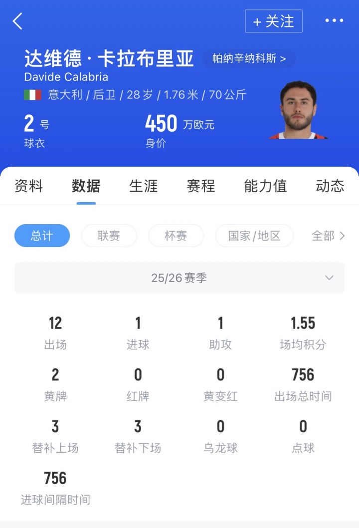 卡拉布里亚现年28岁,这位米兰前队长今夏自由身加盟帕纳辛纳科斯,目前已是球队的主力首发。