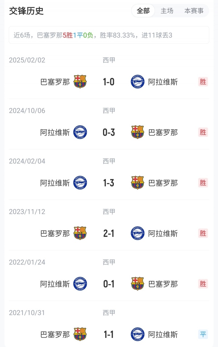目前西甲积分榜上,巴萨10胜1平2负积31分,位列第2,上轮欧冠巴萨0-3不敌切尔西;阿拉维斯4胜3平6负积15分,位列第14。