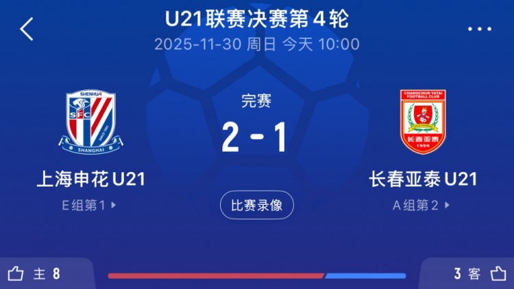 11月30日讯 中超U21联赛决赛阶段第4轮,上海申花2-1击败长春亚泰。