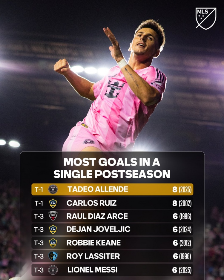 12月2日讯 美职联官方统计了球员在单届季后赛中的进球数量,并列出榜单,阿连德8球并列居首,梅西6球。