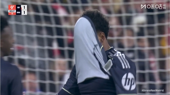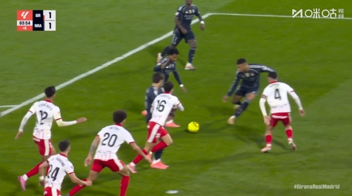 西甲第14轮,皇马客场1-1战平赫罗纳,读秒阶段皇马获得绝杀机会,贝林厄姆禁区横敲,正对球门的罗德里戈调整步点准备射门,这时正对来球但侧对球门的姆巴佩半路杀出,转身兜射打偏。