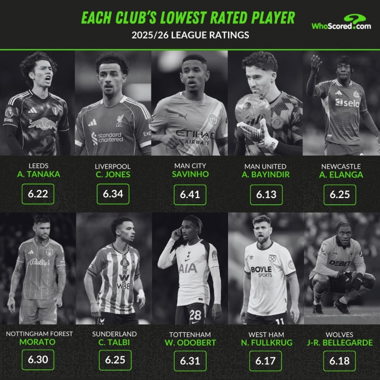 本赛季英超各队场均评分最低球员(至少出场400分钟):