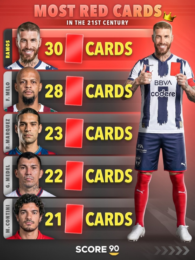 据score90数据统计,在21世纪红牌和黄牌的数据统计中,拉莫斯以30张红牌、279张黄牌双双登顶榜首。