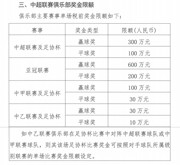 中足联:中超球队联赛单场赢球奖不超过300万元,亚冠不超过600万