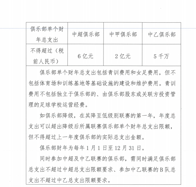 中足联官方:中超俱乐部单个财年总支出不得超税前6亿,中甲2亿