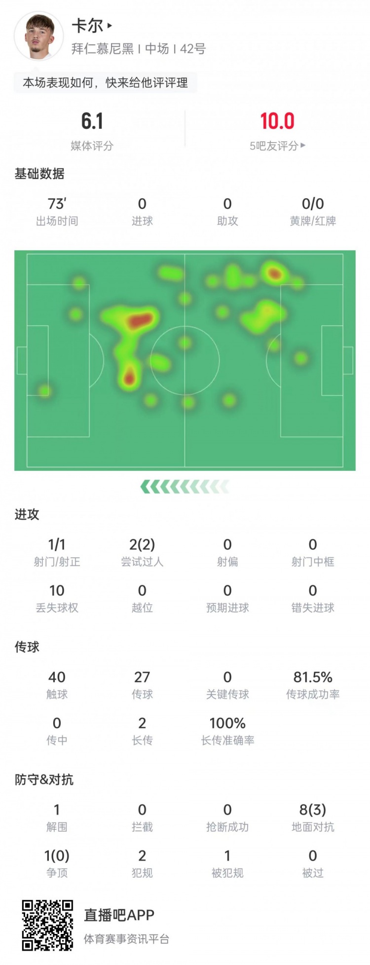 17岁伦纳特·卡尔此役为拜仁首发出战,完成2次过人,2脚长传全部成功,他当选本场比赛最佳球员。