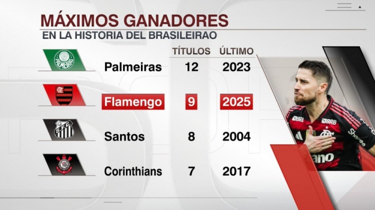 12月4日讯 巴甲第37轮,弗拉门戈主场1-0击败塞阿拉,提前一轮夺得2025赛季巴甲冠军。ESPN统计了球队夺得巴甲冠军的次数,并列出榜单,弗拉门戈9次夺冠排名第二位。