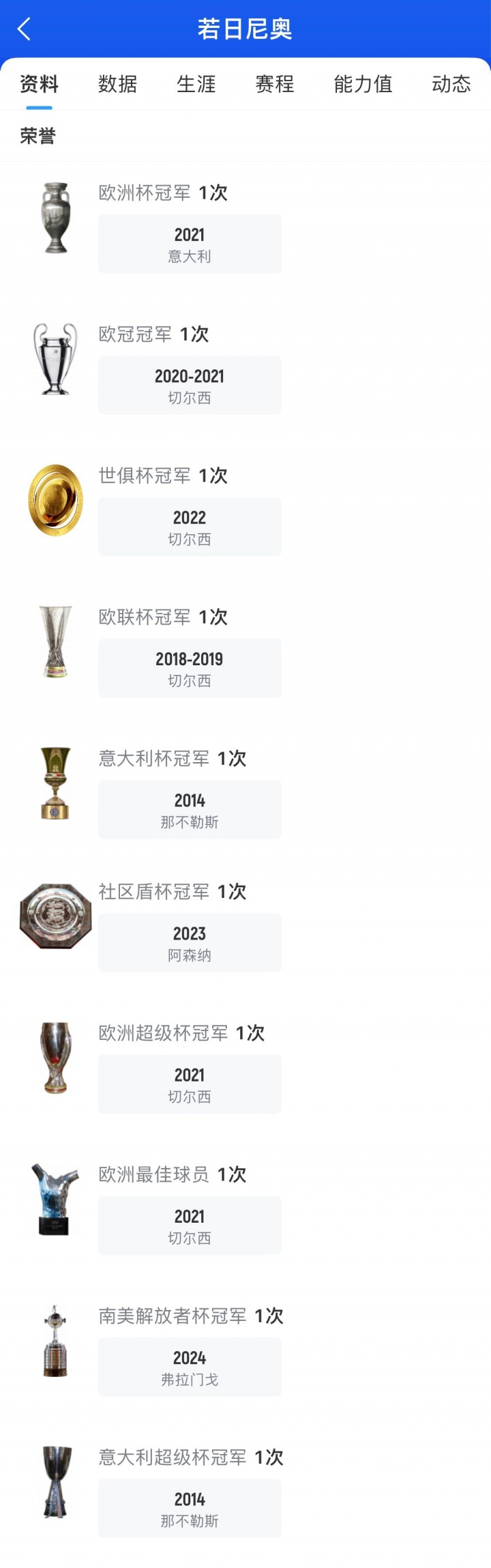 2021年是若日尼奥职业生涯巅峰期,他帮助切尔西赢得欧冠冠军,为意大利赢得欧洲杯冠军,在当年的金球奖排名中,若日尼奥排在第三位。