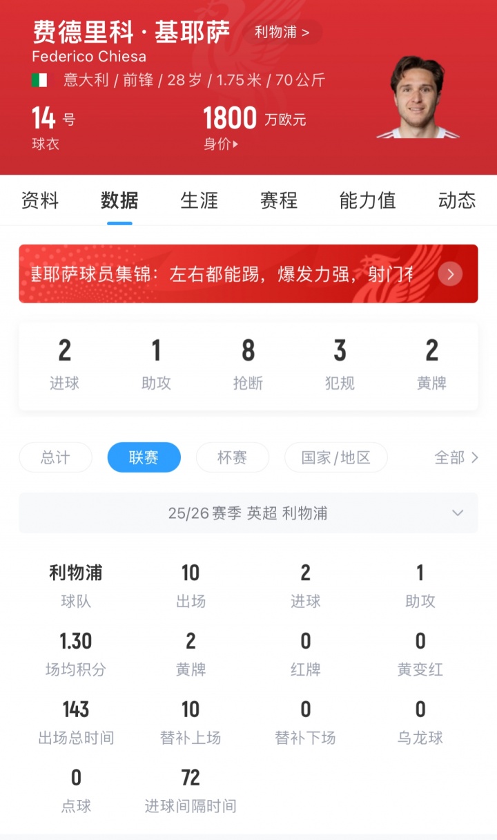 基耶萨现年28岁,他去年从尤文加盟利物浦,为球队出场29次,贡献4球5助,现身价1800万欧,周薪15万镑。