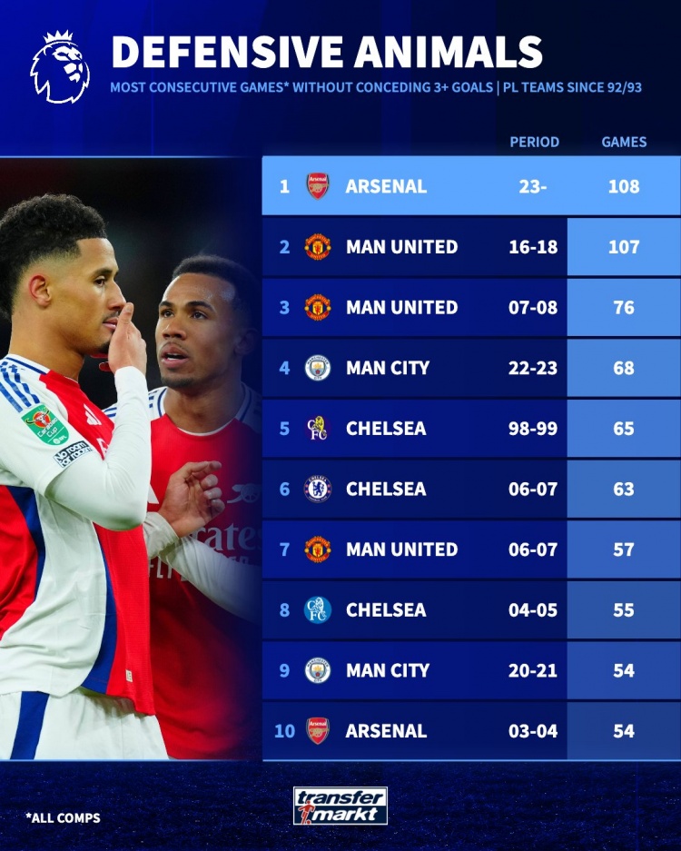 12月4日讯 据德国转会市场统计,阿森纳连续108场各赛事比赛失球少于3粒,创造1992-1993赛季以来英超球队纪录。