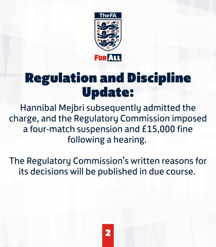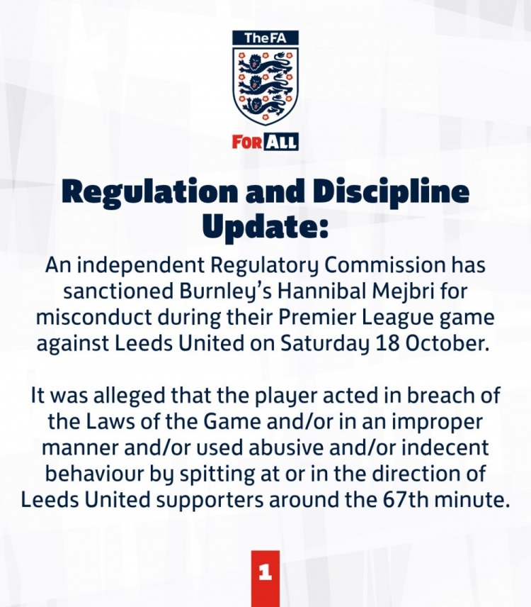 公告指出,梅布里在比赛第六十七分钟前后朝利兹联球迷方向吐口水,违反比赛规则与行为准则。