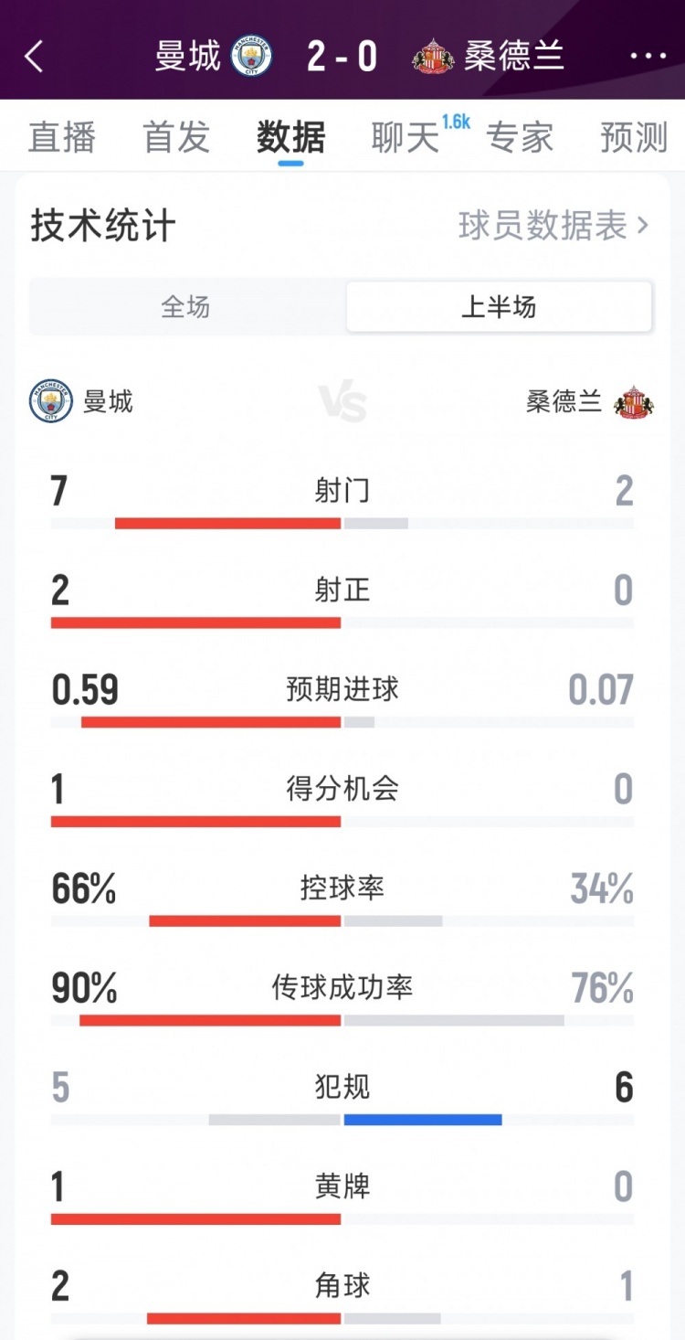12月6日讯 本轮英超曼城对阵桑德兰半场战罢,曼城暂时2-0领先,以下为双方半场数据对比: