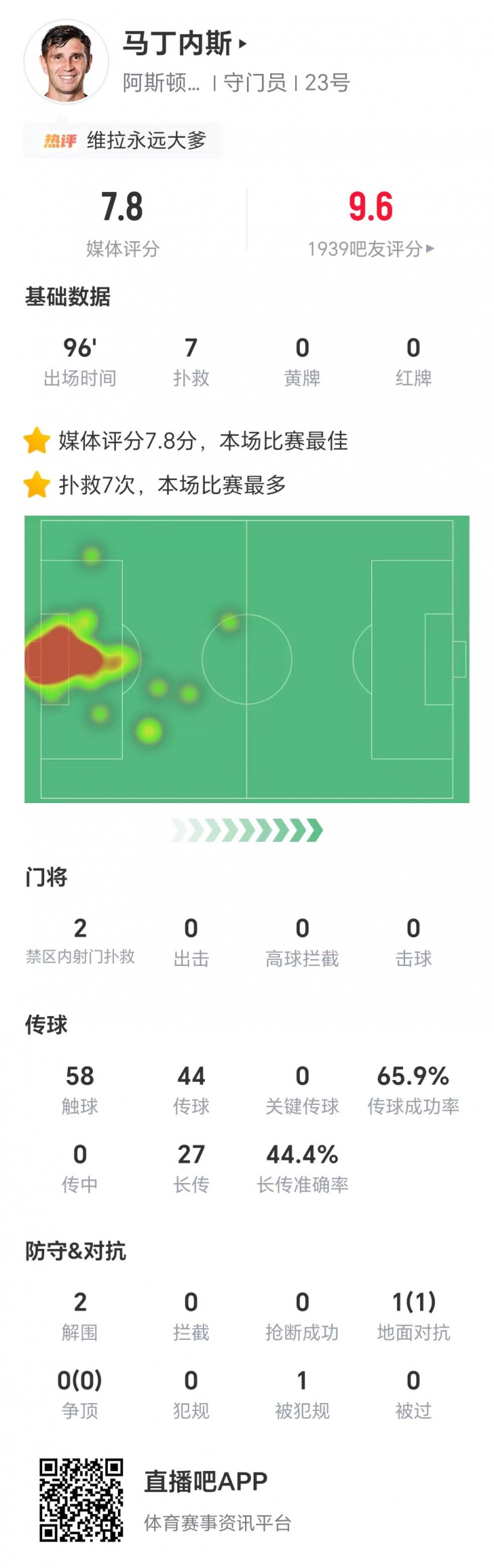 赛后技术统计数据显示,大马丁本场比赛7次扑救,其中2次禁区内射门扑救。另外,他还有两次解围,1次成功地面对抗。