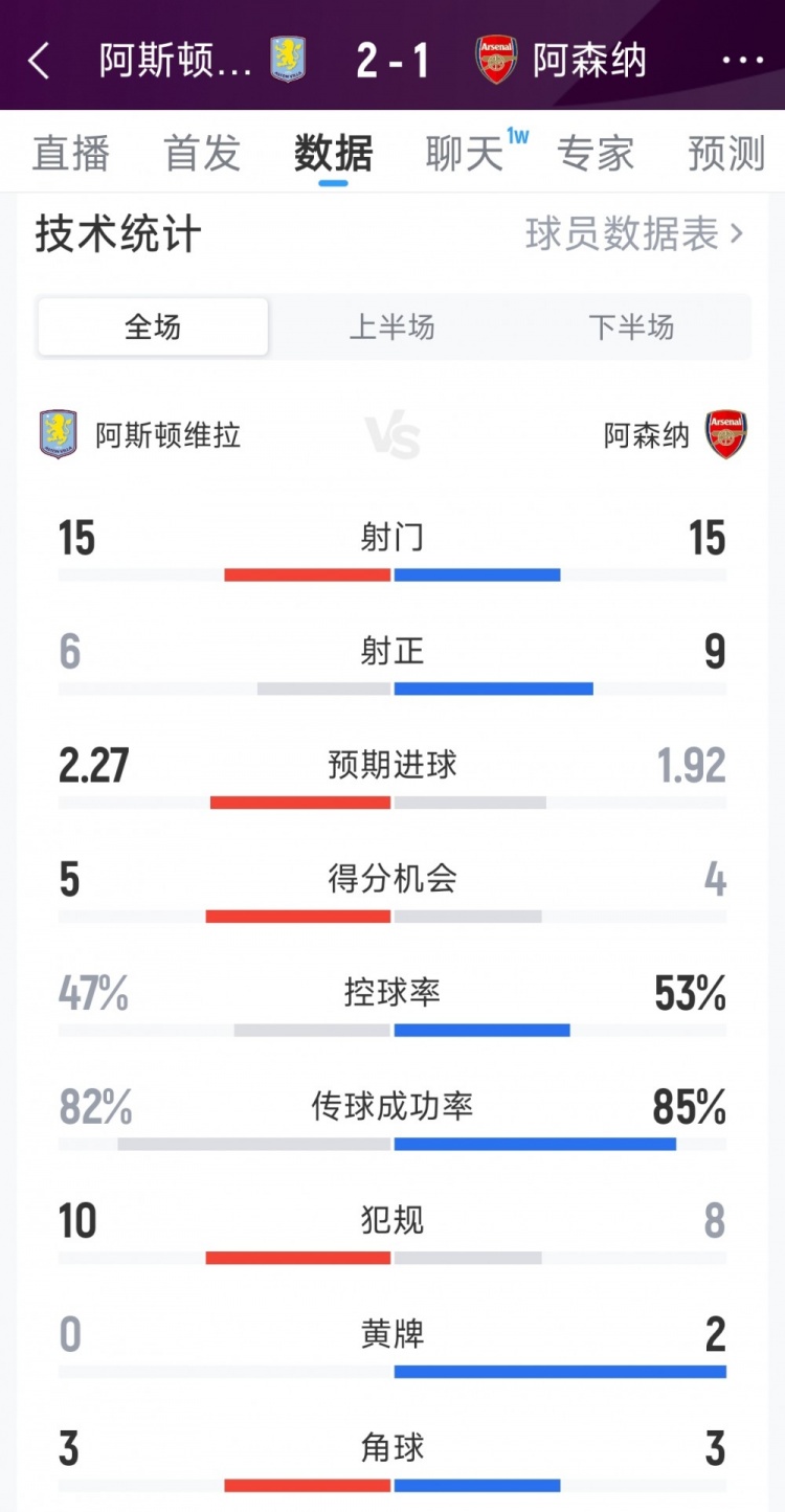 12月6日讯 在本轮英超,阿森纳1-2遭维拉绝杀。以下为双方全场数据对比: