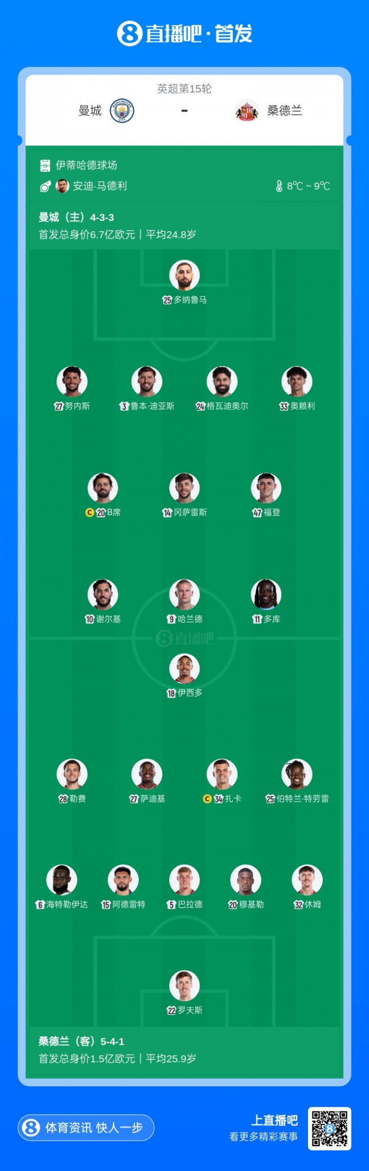 曼城vs桑德兰首发:哈兰德、谢尔基先发,多库出战,赖因德斯替补