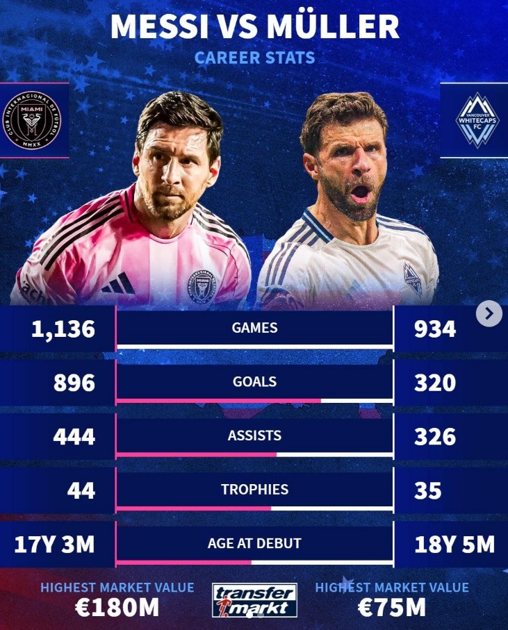 12月7日讯 美职联总决赛即将打响,德转也对比了梅西与穆勒生涯数据,具体如下: