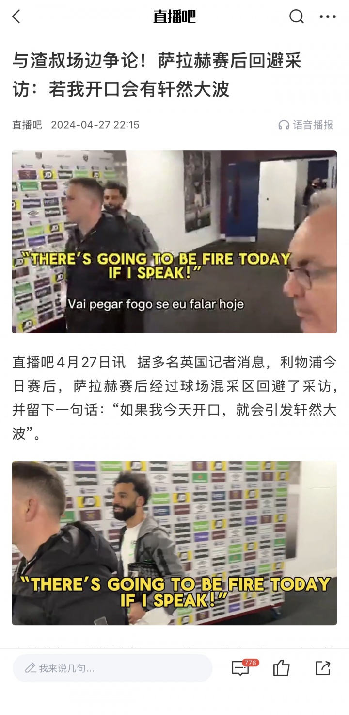 2024年4月,被迫替补的萨拉赫曾与时任利物浦主帅克洛普在场上发生争吵,赛后萨拉赫路过混采区表示:“如果我今天开口,就会引发轩然大波。”