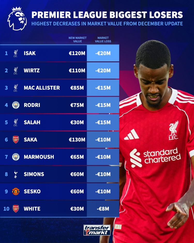 12月9日讯 德转更新英超球员身价,伊萨克、维尔茨均-2000万欧,为本次更新身价下降最多的英超球员。