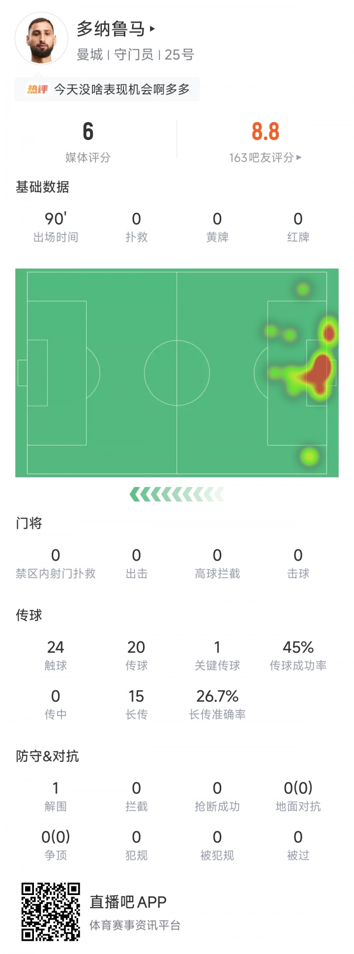 本场比赛皇马狂轰16脚,但是只有1脚射正,即罗德里戈的进球。多纳鲁马没有扑到这球,因此全场比赛0扑救,成为了“射正亡”。