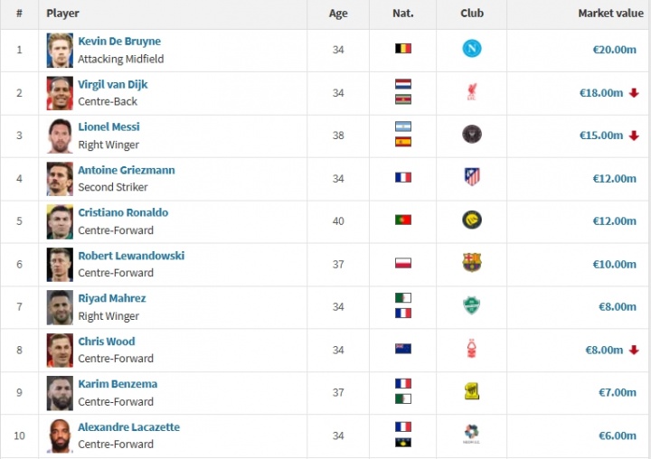 老将身价榜:34岁丁丁2000万第1,38岁梅西1500万,40岁C罗1200万