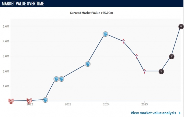 阿连德加盟迈阿密国际后,身价已经两连升,从200万欧升至500万欧。