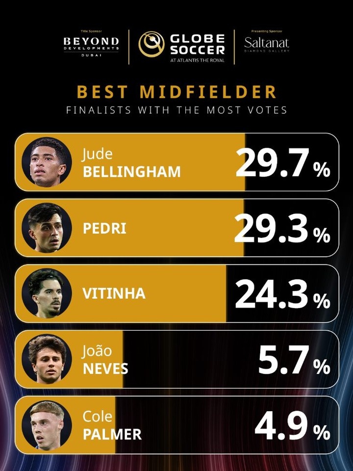 12月12日讯 环球足球奖公布了年度最佳中场的投票情况,贝林厄姆居首,佩德里次席。