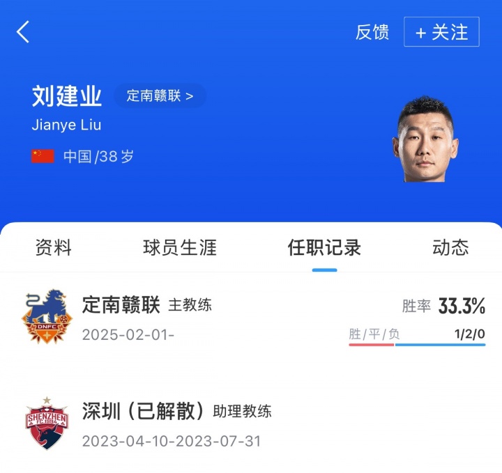 现年38岁的刘建业于2023年初退役,此前曾担任深圳队助理教练,在2025赛季执教中甲球队定南赣联,带队取得了11胜11平8负的战绩,排名中甲第6位,并入选了中甲年度最佳教练候选。