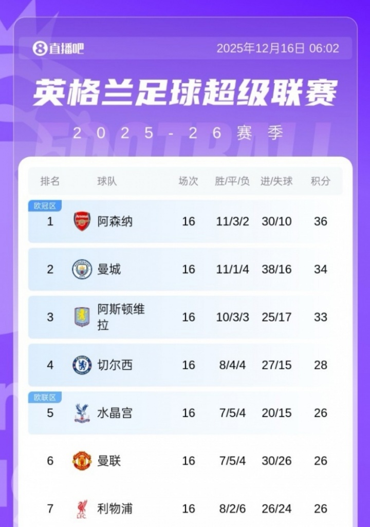 英超积分榜:曼联4轮不败2胜2平升至第六;阿森纳2分优势领先曼城