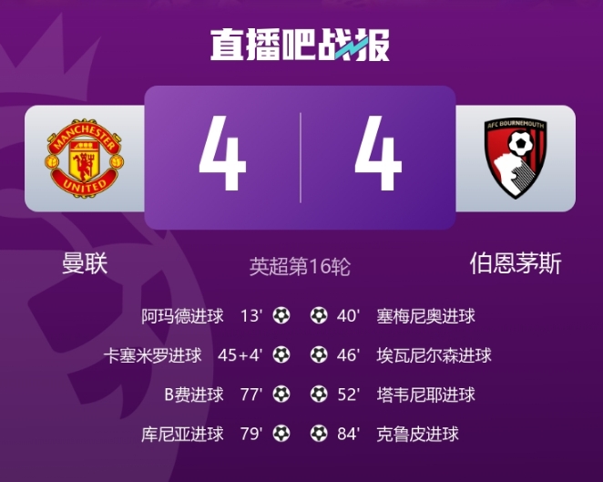曼联本轮与伯恩茅斯上演进球大战,双方4-4战平,B费任意球破门并传射。