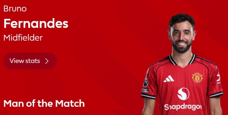 B费传射建功发挥出色,赛后他也当选英超官方评选出的本场最佳球员。